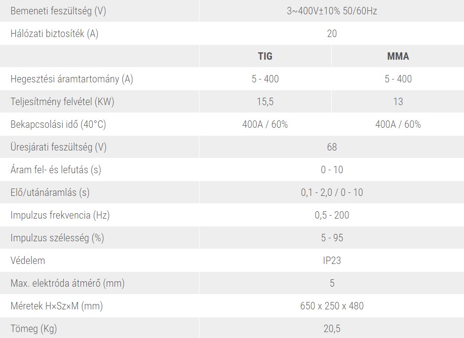 - IMPULZUS AWI (TIG) FUNKCIÓ! (állítható 0,5-200Hz), minimalizált torzítás, alacsony hőbevitel