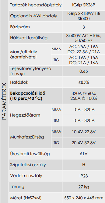 - A digitális kijelző a hegesztés megkezdéséig a beállított paramétereket mutatja, hegesztés közben pedig a pillanatnyi kimeneti áramerősséget.