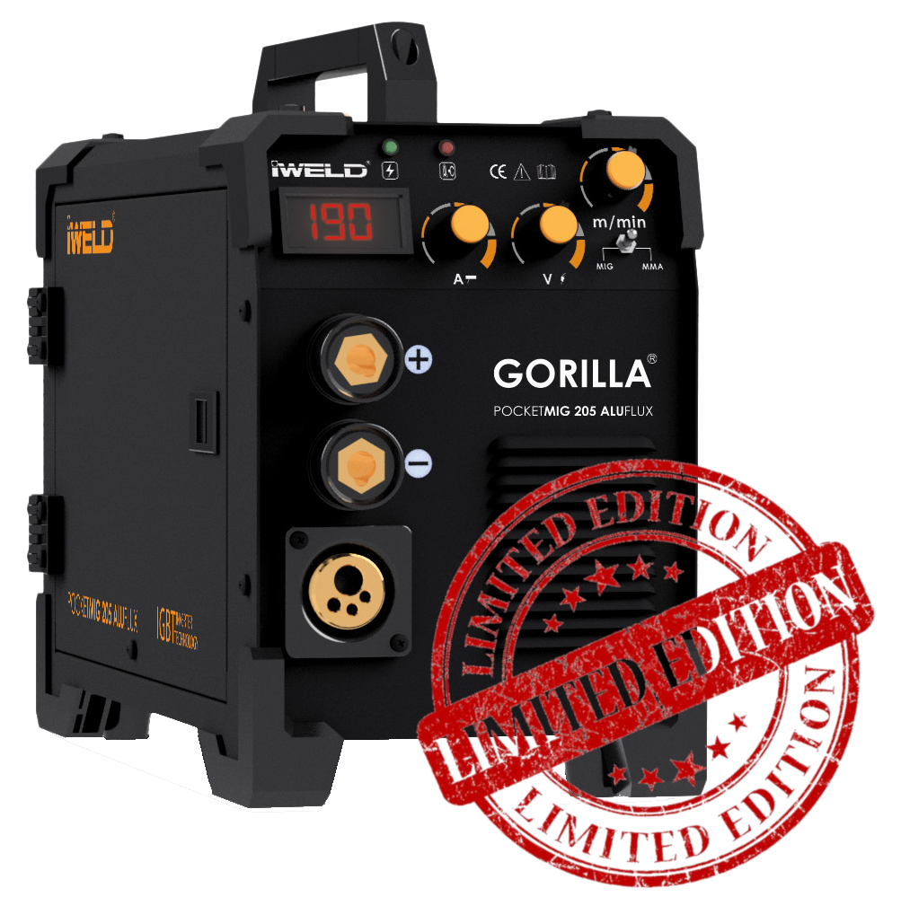 A 2018-as év favoritja a GORILLA POCKETMIG 195 ALUFLUX leváltására , a vásárlói igényeknek megfelelően két új gép került a piacra. Ezek közül a nagyobbik a POCKETMIG 205 ALUFLUX, melyet most ismét megújítottak. Ezúttal fekete külsőt kapott.