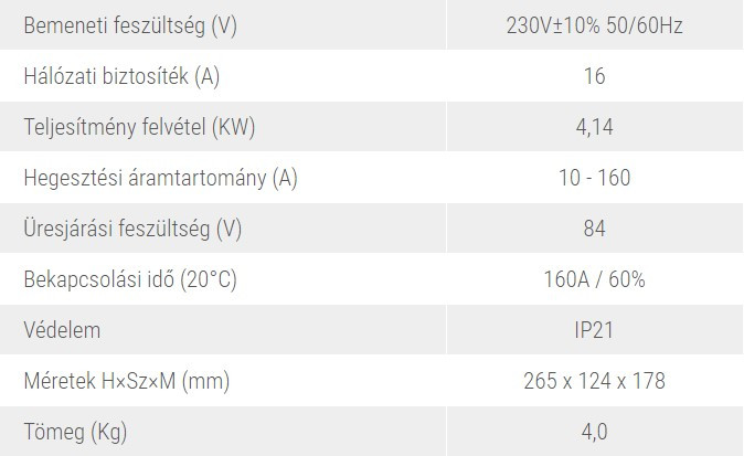 - VRD FUNKCIÓ (Voltage Reduction Device) az üresjárási feszültséget korlátozó biztonsági funkció MMA üzemmódban történő hegesztés esetén, magas páratartalmú (nedves) környezetben