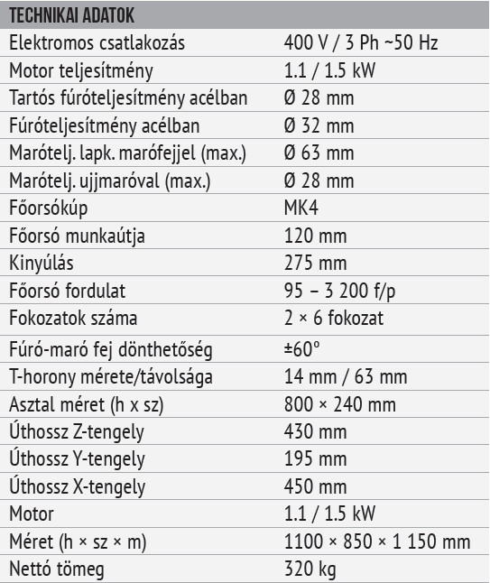 - Külön kézikarral előtolható főorsó fúrához, menetvágához.