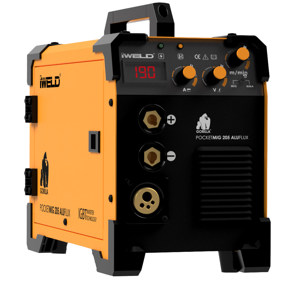 A GORILLA POCKETMIG 185 ALUFLUX kapott digitális kijelzőt, belső polaritáscserélő csatlakozókat és megmaradt a bevont elektródás hegesztés (MMA) lehetősége. A gép előtoló szerkezete most egy sokkal robusztusabb típust kapott a hosszú hibátlan működés érdekében. A gép inverteres technológiájú, a szokásos már jól bevált jelleggörbét kapta amivel egészen vékony lemezektől a legvastagabbig tökéletes munkát tud végezni!