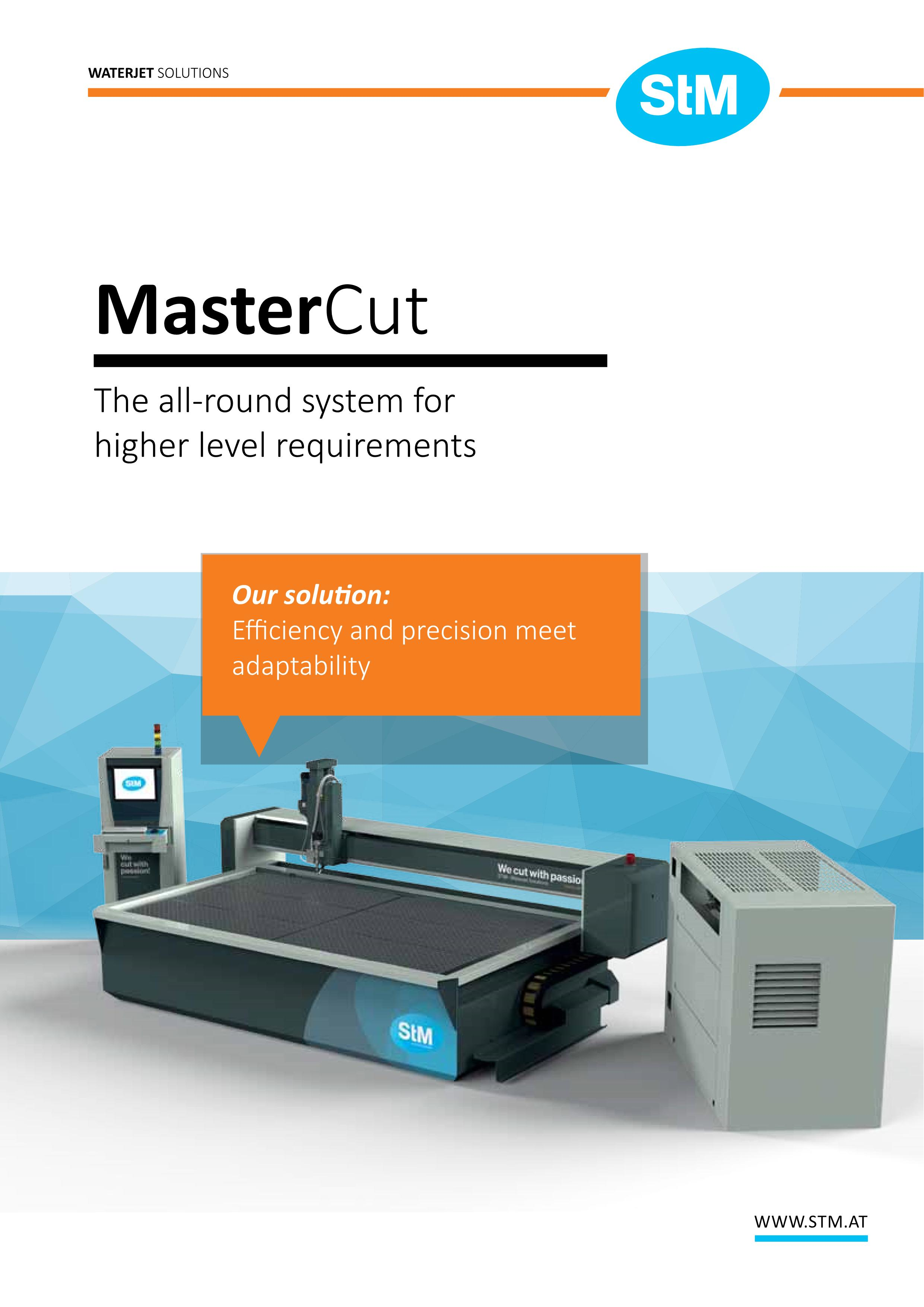 A MasterCut rendszerek lehetővé teszik a háromtengelyes 3D vágások készítését vagy a 2D-s vágást. A rendszerek erőforrás-hatékonyan működnek és rendkívül alacsony energia-, víz- és sűrített levegőfogyasztással rendelkeznek. A kialakítás minden alkatrésze és csavarja kopásálló rozsdamentes acélból vagy alumíniumból készült. A teljesen digitális meghajtó kefe nélküli AC szervomotorokból áll, több tengelyű NUM vagy Eckelmann CNC vezérlőegységgel. A megfelelő szoftver MS-Windows rendszeren fut, és csak szabványos PC-t igényel.