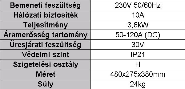 Nagyteljesítményű, egyfázisú, hagyományos 230 V/10 A/50 Hz hálózatról működtethető hegesztő gép.