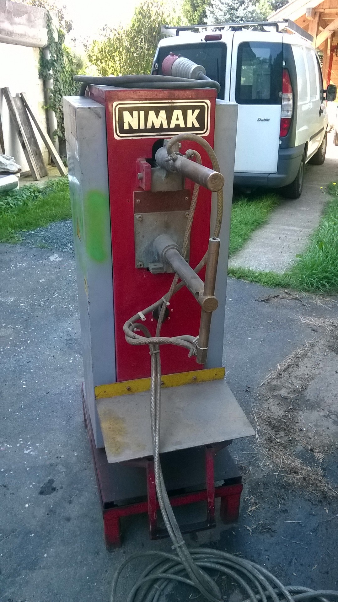 Német NIMAK gyártmányú állványos ponthegesztőgép 27kVA maximális teljesítménnyel és 10 000 A-es hegesztőárammal, max. 180 daN nyomóerővel ami elégséges 3+3 mm lemezek ponthegesztéséhez. Lábpedálos, mechanikus működtetés, víz hűtött karok, 5 fokozat, időszabályozás.