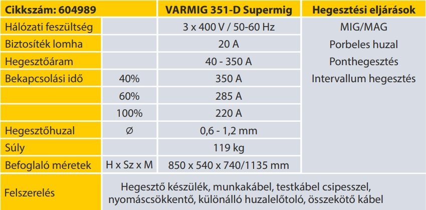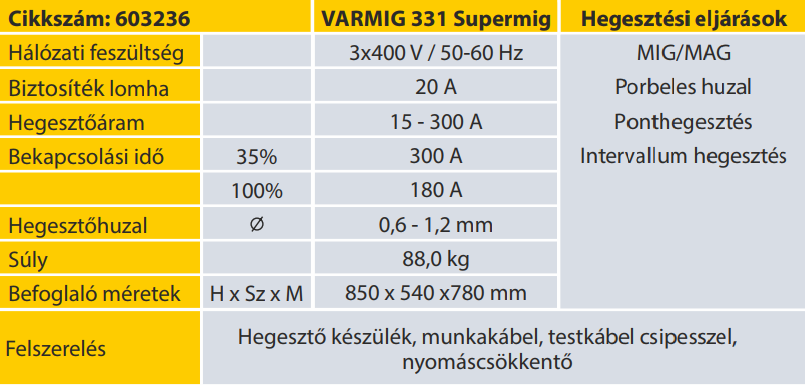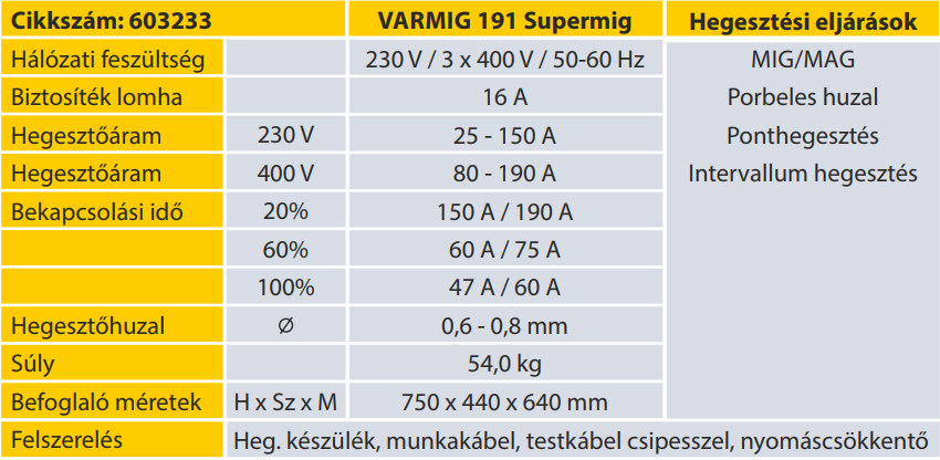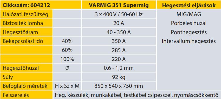 A VARMIG Supermig hegesztőkészülékek MIG/MAG hegesztésre alkalmasak. A kisipari műhelyekben, karbantartási munkálatoknál és az iparban egyaránt használhatóak. A készülékekkel szerkezeti acél valamint a megfelelő tartozékok és hozaganyag használatával alumínium és CrNi is hegeszthető. A Varmig Supermig gépcsalád széles hegesztőáram tartományú, jó bekapcsolási idő és százalékarányokkal rendelkezik
