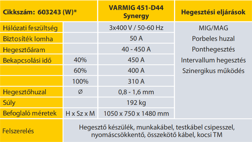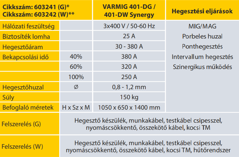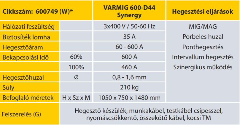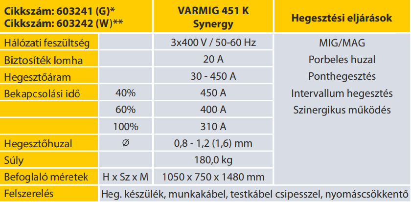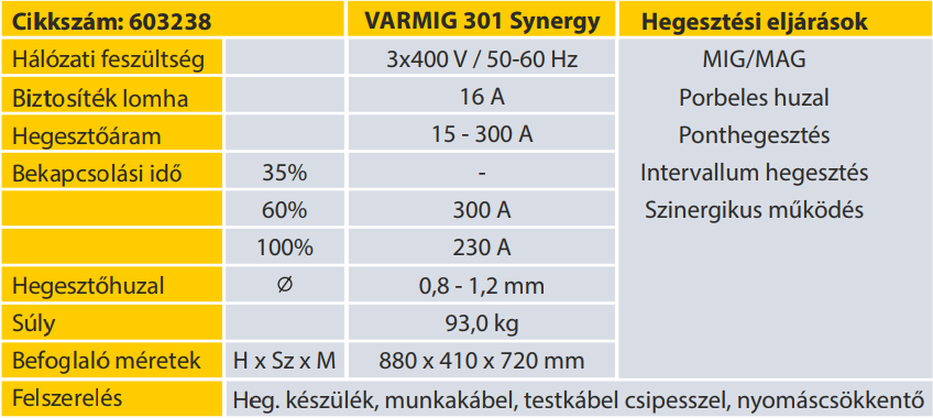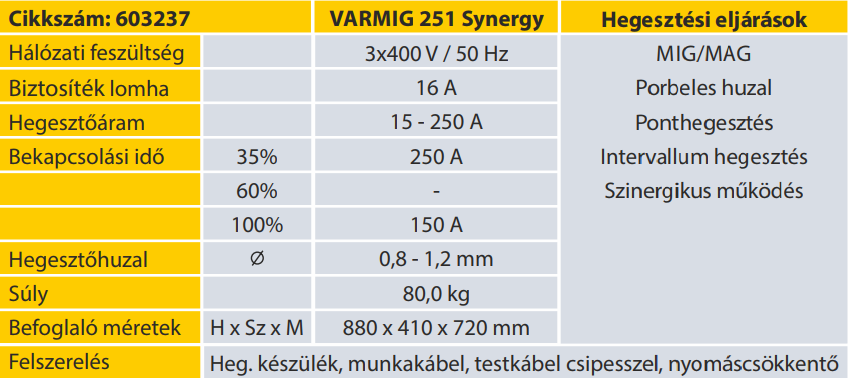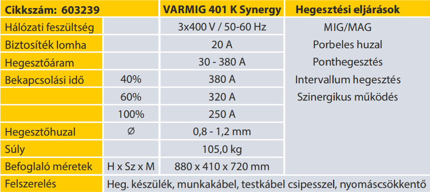 A Varmig Synergy MIG/MAG hegesztőkészülékek védőgázzal történő hegesztésre alkalmasak. A készülékekkel szerkezeti acél valamint a megfelelő tartozékok és hozaganyag használatával alumínium és CrNi is hegeszthető. Széles körben használhatók a gépjármű ipartól, a gépgyártásig, hajógyárakban az egyszerű hegesztési munkálatokra is. A mikroprocesszoros vezérlés lehetővé teszi a szinergikus működtetést, programozott vagy manuális hegesztőparaméterek beállítását, soft start (könnyű indulás) funkciót, a hegesztési feszültség digitális szabályozását és a huzalelőtolás sebességének jelzését.