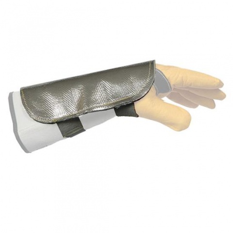 A kézvédő a hegesztőkesztyűvel együtt használandó, elősegítve a hősugárzás elleni hatékonyabb védelmet.